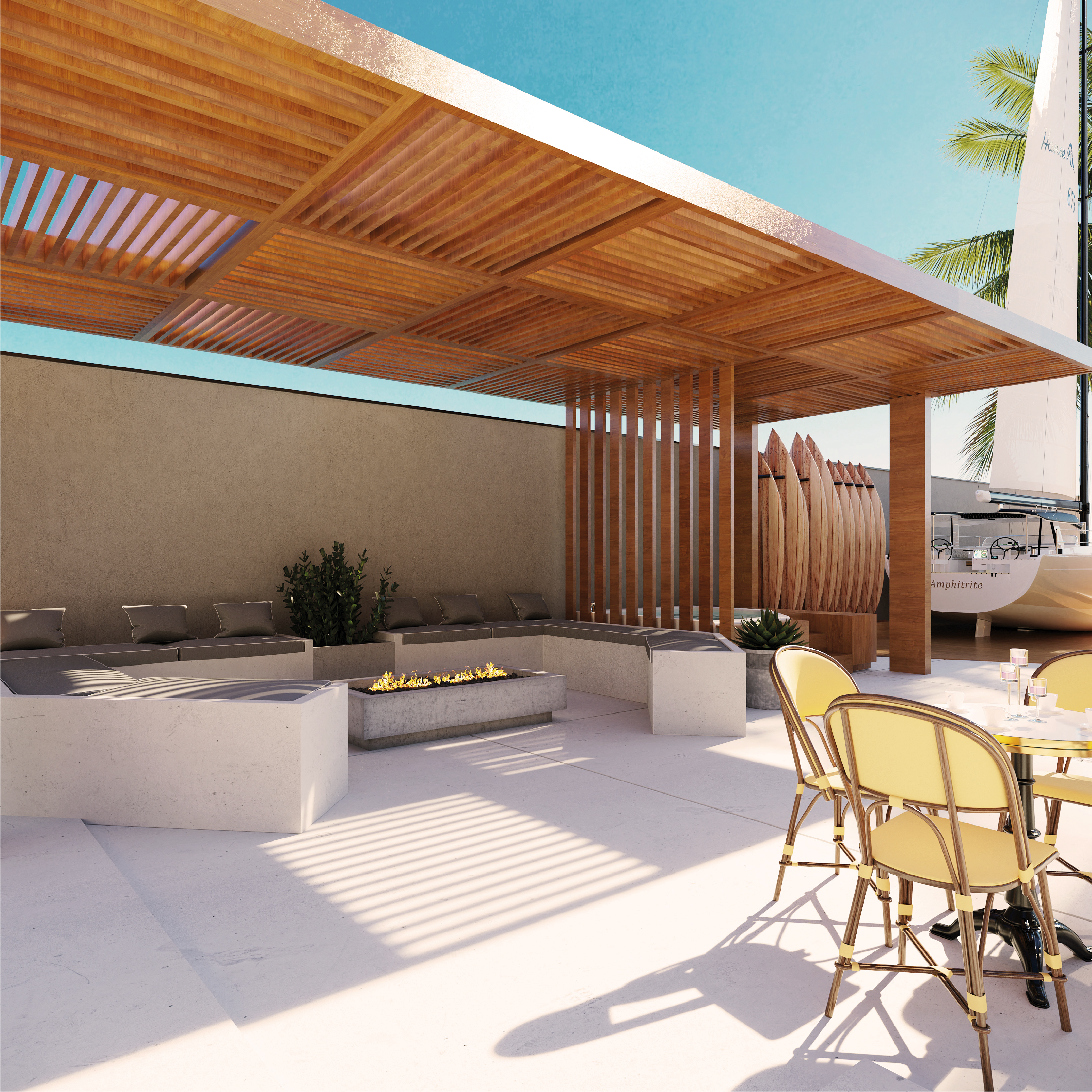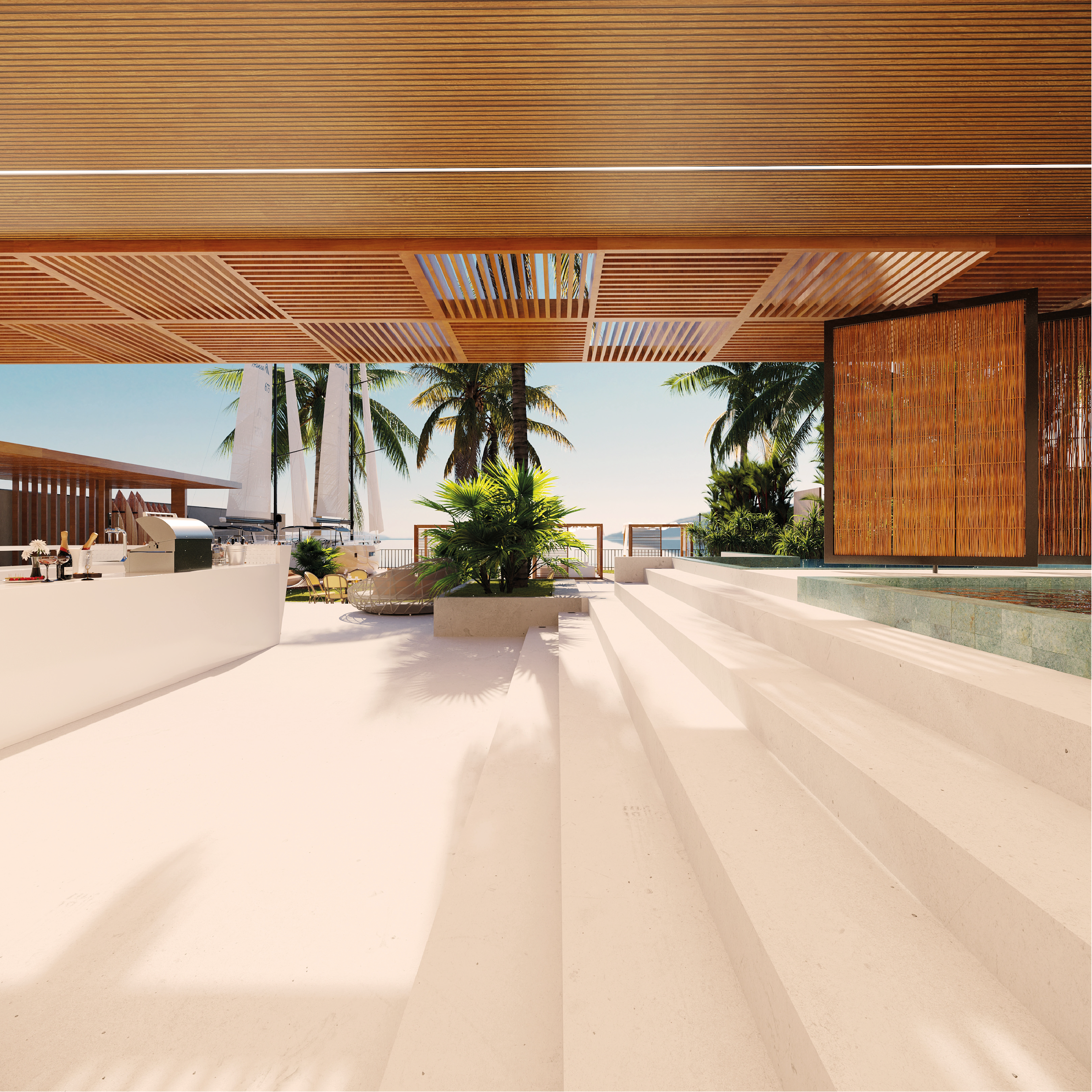 A sensação de estar de férias em um resort, com uma arquitetura que combina elementos e cores encontrados nas famosas ilhas gregas, geram nas famílias aqui residentes uma percepção de conexão e encontro com a natureza e o mar.